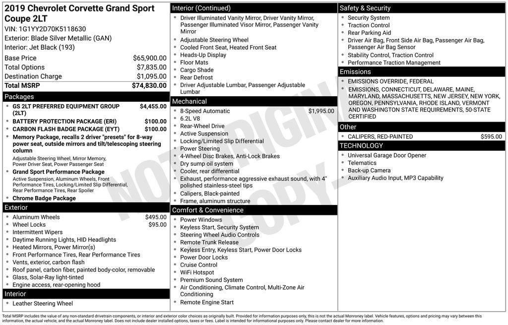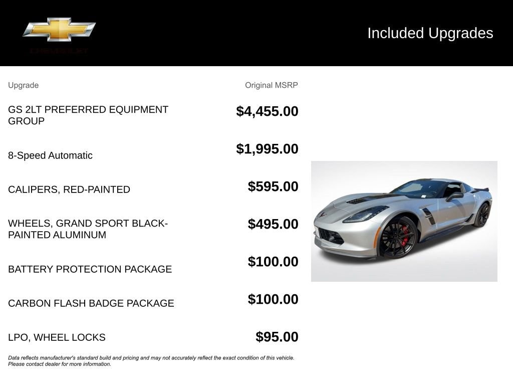 Battery Protection Package, Carbon Flash Badge Package, Memory Package, Preferred Equipment Group 2LT (Auto-Dimming Inside Frameless Rearview Mirror, Body-Color Outside Heated Power-Adjustable Mirrors, Bose Advanced 10-Speaker Audio System Feature, Cargo Net, Front Curb View Cameras, Head-Up Display, Heated & Vented Driver & Front Passenger Seats, Luggage Shade, Power Lumbar/Bolster Seat Adjusters, SiriusXM Radio, Theft Deterrent System, and Universal Home Remote), Corvette Grand Sport 2LT, 2D Coupe, 6.2L V8, 8 Speed Paddle Shift with Automatic Modes, RWD, Blade Silver Metallic, Jet Black Leather, 2.73 Limited Slip Performance Rear Axle Ratio, 4-Wheel Disc Brakes, 8-Way Driver & Passenger Seat Adjusters, 9 Speakers, ABS brakes, Adaptive suspension, Air Conditioning, Alloy wheels, AM/FM radio: SiriusXM, Apple CarPlay/Android Auto, Automatic temperature control, Bose Premium 9-Speaker Audio System Feature, Bumpers: body-color, Compass, Delay-off headlights, Driver door bin, Driver vanity mirror, Dual front impact airbags, Dual front side impact airbags, Electronic Stability Control, Emergency communication system, Exterior Parking Camera Rear, Four wheel independent suspension, Front anti-roll bar, Front Bucket Seats, Front Center Armrest, Front dual zone A/C, Front reading lights, Fully automatic headlights, GT Bucket Seats, Heads-Up Display, Heated door mirrors, High-Intensity Discharge Headlights, Illuminated entry, Leather Shift Knob, Leather steering wheel, Low tire pressure warning, Occupant sensing airbag, Outside temperature display, Painted Body-Color Carbon Fiber Removable Roof Panel, Panic alarm, Passenger door bin, Passenger vanity mirror, Power door mirrors, Power driver seat, Power passenger seat, Power steering, Power windows, Radio data system, Radio: Chevrolet Infotainment System, Rear anti-roll bar, Rear window defroster, Red-Painted Calipers, Remote keyless entry, Remote Vehicle Starter System, Speed control, Speed-sensing steering, Spoiler, Sport steering wheel, Steering wheel mounted audio controls, Tachometer, Telescoping steering wheel, Tilt steering wheel, Traction control, Trip computer, Variably intermittent wipers, Voltmeter, Wheel Locks, Wheels: 19 x 10 Fr & 20 x 12 Rr Grand Sport, and Wheels: 19 x 10 Fr & 20 x 12 Rr Grand Sport Pearl.