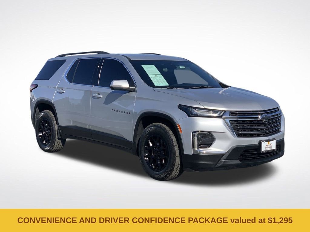 Convenience & Driver Confidence Package (4.2 Multi-Color Enhanced Driver Instrument Display, Heated Driver & Front Passenger Seats, Radio: Chevrolet Infotainment 3 Plus System, Rear Power Liftgate, Remote Start, SiriusXM w/360L, and Universal Home Remote), Front License Plate Bracket Mounting Package, Preferred Equipment Group 1LT (Rear Park Assist w/Audible Warning), Traverse LT 1LT, 4D Sport Utility, 3.6L V6 SIDI VVT, 9-Speed Automatic, FWD, Silver Ice Metallic, Jet Black Cloth, 2-Way Manual Front Passenger Seat Adjuster, 3.49 Axle Ratio, 3rd row seats: split-bench, 4-Wheel Disc Brakes, 6 Speakers, 6-Speaker Audio System Feature, 8-Way Power Driver Seat Adjuster, ABS brakes, Air Conditioning, Alloy wheels, AM/FM radio: SiriusXM, Apple CarPlay/Android Auto, Auto High-beam Headlights, Automatic temperature control, Black Roof Rails, Brake assist, Bumpers: body-color, Compass, Delay-off headlights, Driver door bin, Driver vanity mirror, Dual front impact airbags, Dual front side impact airbags, Electronic Stability Control, Emergency communication system: OnStar Guidance, Exterior Parking Camera Rear, Four wheel independent suspension, Front anti-roll bar, Front Bucket Seats, Front Center Armrest, Front dual zone A/C, Front reading lights, Fully automatic headlights, HD Surround Vision, Heated door mirrors, Illuminated entry, Leather steering wheel, Low tire pressure warning, Not Equipped w/Dr & Fr Pass Heated or Ventilated Seats, Occupant sensing airbag, Outside temperature display, Overhead airbag, Overhead console, Panic alarm, Passenger door bin, Passenger vanity mirror, Power door mirrors, Power Driver Lumbar Control, Power driver seat, Power steering, Power windows, Premium Cloth Seat Trim, Radio data system, Radio: Chevrolet Infotainment System AM/FM Stereo, Rear air conditioning, Rear anti-roll bar, Rear Camera Mirror, Rear Camera Mirror Washer, Rear Pedestrian Alert, Rear reading lights, Rear window defroster, Rear window wiper, Remote keyless entry, Roof rack: rails only, Security system, SiriusXM Radio, Speed control, Speed-sensing steering, Spoiler, Steering wheel mounted audio controls, Tachometer, Telescoping steering wheel, Tilt steering wheel, Traction control, Trip computer, Turn signal indicator mirrors, Variably intermittent wipers, Voltmeter, and Wheels: 18 Bright Silver-Painted Aluminum.