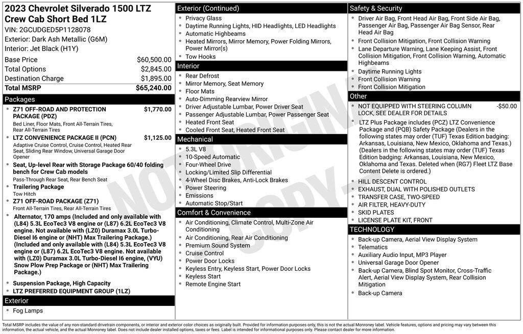 Dark Ash Metallic 2023 Chevrolet Silverado 1500 LTZ 4WD 10-Speed Automatic EcoTec3 5.3L V8 Silverado 1500 LTZ, 4D Crew Cab, EcoTec3 5.3L V8, 10-Speed Automatic, 4WD, Dark Ash Metallic, Jet Black Leather.