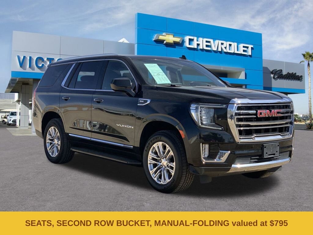 License Plate Front Mounting Package, Preferred Equipment Group 4SA (2 Presets For Power Driver Seat, Bose 9-Speaker Stereo Audio System Feature, Bright Chrome Bodyside Moldings, Bright Front & Rear Door Sill Plates, Chrome Door Handles w/Body-Color Strip, Hands-Free Power Programmable Rear Liftgate, Heated & Ventilated Driver & Front Passenger Seats, Heated Driver & Front Passenger Seats, Inside Rear-View Auto-Dimming Mirror, Safety Alert Seat, Universal Home Remote, and Wireless Charging), Yukon SLT, 4D Sport Utility, EcoTec3 5.3L V8, 10-Speed Automatic with Overdrive, 4WD, Onyx Black, Black Leather, 2nd Row Manual-Folding Bucket Seats, 3.23 Rear Axle Ratio, 3rd row seats: split-bench, 4-Wheel Disc Brakes, 9 Speakers, ABS brakes, Air Conditioning, Alloy wheels, AM/FM radio: SiriusXM with 360L, AM/FM Stereo, Apple CarPlay/Android Auto, Auto High-beam Headlights, Auto-dimming Rear-View mirror, Automatic Emergency Braking, Automatic temperature control, Bodyside moldings, Brake assist, Bumpers: body-color, Compass, Delay-off headlights, Deleted 3 Years of OnStar & Connected Services Plan, Driver door bin, Driver vanity mirror, Dual front impact airbags, Dual front side impact airbags, Electronic Stability Control, Emergency communication system: OnStar and GMC connected services capable, Following Distance Indicator, Forward Collision Alert, Four wheel independent suspension, Front & Rear Park Assist, Front anti-roll bar, Front Bucket Seats, Front Center Armrest, Front dual zone A/C, Front fog lights, Front Pedestrian Braking, Front reading lights, Fully automatic headlights, Garage door transmitter, Heated door mirrors, Heated front seats, Illuminated entry, IntelliBeam Automatic High Beam On/Off, Lane Change Alert w/Side Blind Zone Alert, Lane Keep Assist w/Lane Departure Warning, Low tire pressure warning, Memory seat, Navigation System, Not Equipped w/4-Way Driver & Fr Pass Pwr Lumbar, Occupant sensing airbag, Outside temperature display, Overhead airbag, Overhead console, Panic alarm, Passenger door bin, Passenger vanity mirror, Perforated Leather-Appointed Seating, Power door mirrors, Power driver seat, Power Liftgate, Power passenger seat, Power steering, Power windows, Premium Smooth Ride Suspension, Rain sensing wipers, Rear air conditioning, Rear anti-roll bar, Rear Cross Traffic Alert, Rear reading lights, Rear seat center armrest, Rear window defroster, Rear window wiper, Remote keyless entry, Roof rack: rails only, Security system, SiriusXM w/360L, Speed control, Speed-sensing steering, Split folding rear seat, Spoiler, Steering wheel mounted audio controls, Tachometer, Telescoping steering wheel, Tilt steering wheel, Traction control, Trip computer, Variably intermittent wipers, Ventilated front seats, Voltmeter, and Wheels: 20 x 9 6-Spoke Polished Aluminum.