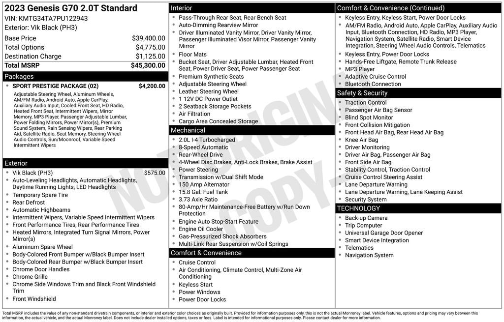 Vik Black 2023 Genesis G70 2.0T RWD 8-Speed Automatic with SHIFTRONIC I4 G70 2.0T, 4D Sedan, I4, 8-Speed Automatic with SHIFTRONIC, RWD, Vik Black, Obsidian Blk/Sandstorm Gy Leather.