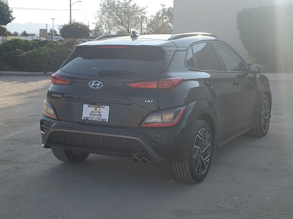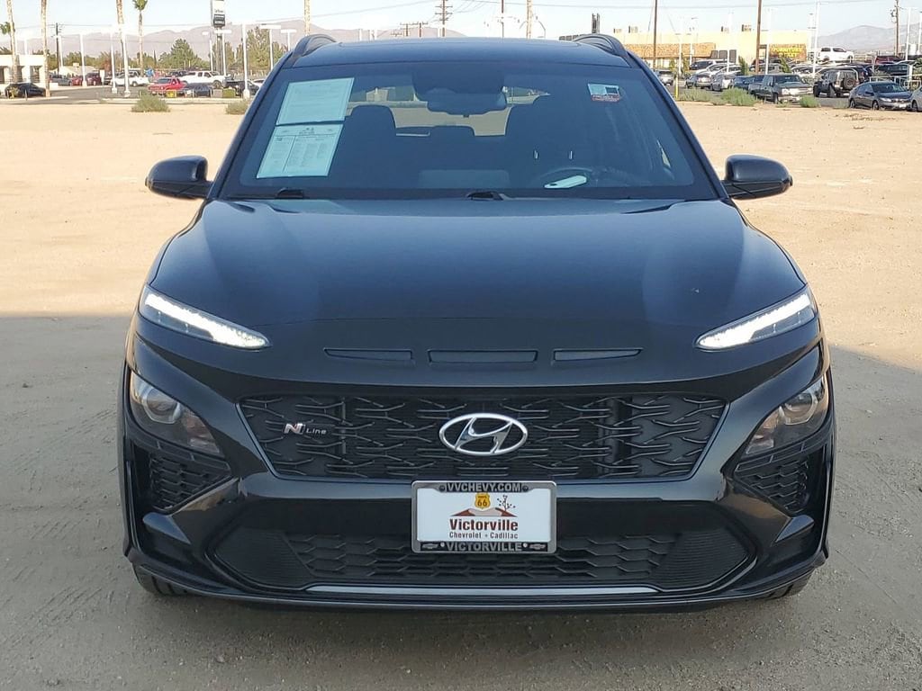 Option Group 01, Kona N Line, 4D Sport Utility, I4, Shiftronic, FWD, Ultra Black Pearl, Black Cloth, 18 x 7.5J Alloy Wheels, 3.174 Axle Ratio, 4-Wheel Disc Brakes, 6 Speakers, ABS brakes, Air Conditioning, Alloy wheels, AM/FM radio: SiriusXM, Apple CarPlay & Android Auto, Automatic temperature control, Brake assist, Bumpers: body-color, Cargo Net, Cargo Tray, Carpeted Floor Mats, Delay-off headlights, Driver door bin, Driver vanity mirror, Dual front impact airbags, Dual front side impact airbags, Electronic Stability Control, Emergency communication system: Blue Link Connected Car Service (3-year complimentary subscription), Exterior Parking Camera Rear, Front anti-roll bar, Front Bucket Seats, Front Center Armrest, Front reading lights, Front wheel independent suspension, Fully automatic headlights, Heated door mirrors, Heated front seats, Heated Sport Front Bucket Seats, Illuminated entry, Leather Shift Knob, Leather steering wheel, Low tire pressure warning, Navigation System, Occupant sensing airbag, Outside temperature display, Overhead airbag, Overhead console, Panic alarm, Passenger door bin, Passenger vanity mirror, Power door mirrors, Power driver seat, Power moonroof, Power steering, Power windows, Radio: AM/FM/HD/SiriusXM Audio System, Rear seat center armrest, Rear window defroster, Rear window wiper, Remote keyless entry, Roof Rack Cross Rails (DISC), Security system, Speed control, Speed-sensing steering, Split folding rear seat, Spoiler, Sport Cloth Seat Trim, Steering wheel mounted audio controls, Tachometer, Telescoping steering wheel, Tilt steering wheel, Traction control, Trip computer, Turn signal indicator mirrors, and Variably intermittent wipers.