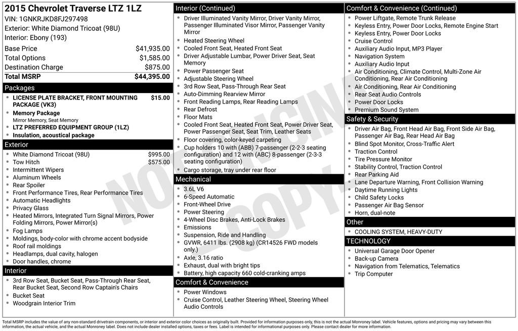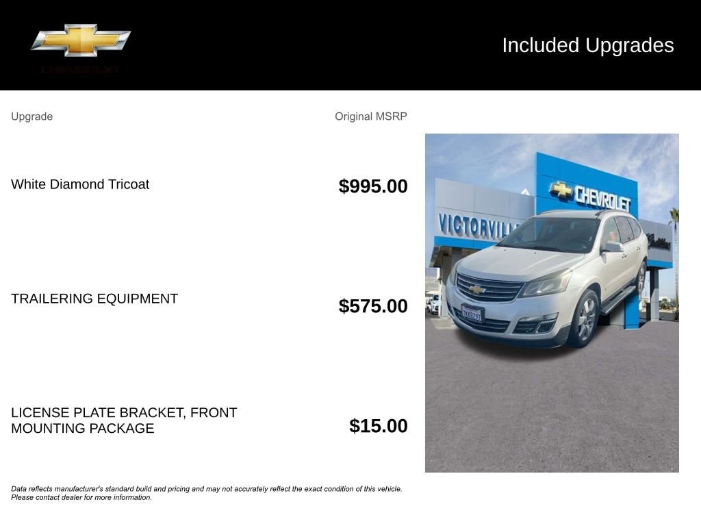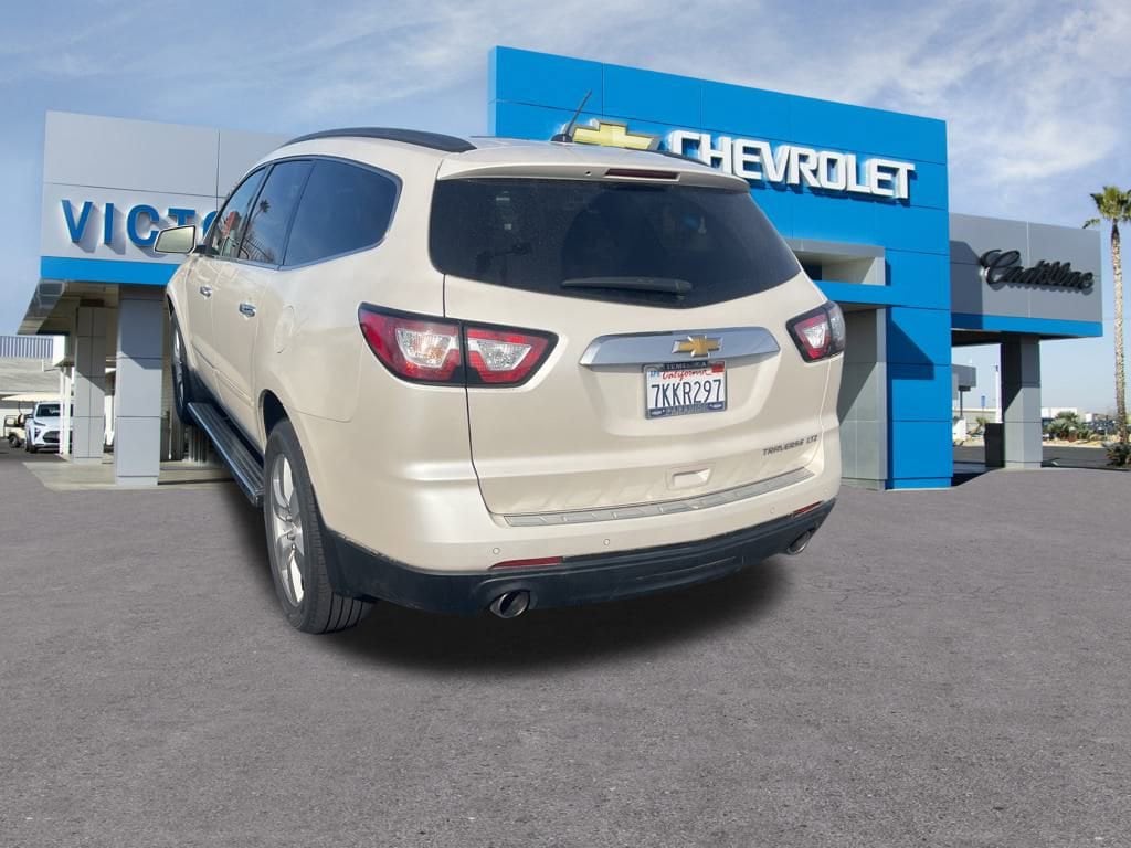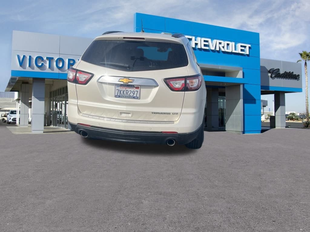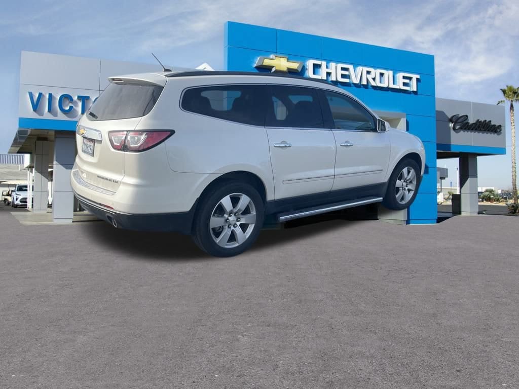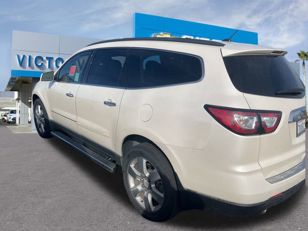 White Diamond Tricoat 2015 Chevrolet Traverse LTZ FWD 6-Speed Automatic 3.6L V6 SIDI Traverse LTZ, 4D Sport Utility, 3.6L V6 SIDI, 6-Speed Automatic, FWD, White Diamond Tricoat, Ebony Leather.Why Buy from Victorville Chevrolet? We have received Chevroletâs Dealer of the Year award multiple years in a row. Been voted locally Best of the Desert by the Daily Press. We are the highest volume selling dealership in the high desert and treat you like family. At Victorville Chevrolet, we do things differently. Our team is built around accuracy, honesty, and accountability from your first interaction to the moment you drive home. We provide: Verified availability checked by real managers Transparent, upfront pricing with no hidden fees A relaxed, zero-pressure experience Fast, consistent communication Access to inventory across Southern California if we donât have your exact match A better Chevy experience starts right here at Victorville Chevrolet. Recent Arrival! Odometer is 41194 miles below market average!Awards:* JD Power Initial Quality Study, JD Power Dependability Study * JD Power Initial Quality Study * 2015 KBB.com Best Buy Awards Finalist * 2015 KBB.com 10 Best Certified Pre-Owned 3-Row SUVs Under $30,000Why Buy from Victorville Chevrolet? We have received Chevroletâs Dealer of the Year award multiple years in a row. Been voted locally Best of the Desert by the Daily Press. We are the highest volume selling dealership in the high desert and treat you like family. At Victorville Chevrolet, we do things differently. Our team is built around accuracy, honesty, and accountability from your first interaction to the moment you drive home. We provide: Verified availability checked by real managers Transparent, upfront pricing with no hidden fees A relaxed, zero-pressure experience Fast, consistent communication Access to inventory across Southern California if we donât have your exact match A better Chevy experience starts right here at Victorville Chevrolet.Reviews:* If you want a big, 3-row midsize SUV that starts under $32,000, holds up to eight passengers, and has a standard V6 and that returns decent fuel economy, the 2015 Chevy Traverse remains a tempting family hauler. Source: KBB.com* Compliant ride quality; generous cargo capacity, even behind the third row; seating for up to eight passengers; top crash test scores. Source: Edmunds