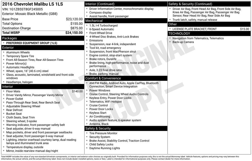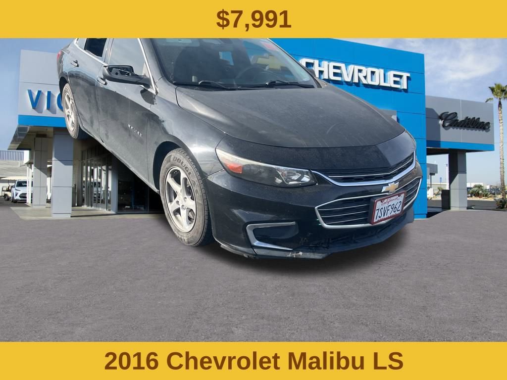 Mosaic Black Metallic 2016 Chevrolet Malibu LS 1LS FWD 6-Speed Automatic 1.5L DOHC Jet Black Cloth.Why Buy from Victorville Chevrolet? We have received Chevroletâs Dealer of the Year award multiple years in a row. Been voted locally Best of the Desert by the Daily Press. We are the highest volume selling dealership in the high desert and treat you like family. At Victorville Chevrolet, we do things differently. Our team is built around accuracy, honesty, and accountability from your first interaction to the moment you drive home. We provide: Verified availability checked by real managers Transparent, upfront pricing with no hidden fees A relaxed, zero-pressure experience Fast, consistent communication Access to inventory across Southern California if we donât have your exact match A better Chevy experience starts right here at Victorville Chevrolet. Recent Arrival! 27/37 City/Highway MPGAwards:* 2016 IIHS Top Safety Pick+ * 2016 IIHS Top Safety Pick+ with optional front crash prevention * 2016 KBB.com Best Buy Awards Finalist * 2016 KBB.com 10 Most Comfortable Cars Under $30,000 * 2016 KBB.com 10 Most Awarded Cars * 2016 KBB.com 16 Best Family Cars * 2016 KBB.com 10 Best Sedans Under $25,000Why Buy from Victorville Chevrolet? We have received Chevroletâs Dealer of the Year award multiple years in a row. Been voted locally Best of the Desert by the Daily Press. We are the highest volume selling dealership in the high desert and treat you like family. At Victorville Chevrolet, we do things differently. Our team is built around accuracy, honesty, and accountability from your first interaction to the moment you drive home. We provide: Verified availability checked by real managers Transparent, upfront pricing with no hidden fees A relaxed, zero-pressure experience Fast, consistent communication Access to inventory across Southern California if we donât have your exact match A better Chevy experience starts right here at Victorville Chevrolet.Reviews:* Spacious interior with tall-person-friendly front seats; sporty handling around turns; hybrid version is respectably quick to accelerate; strong brakes; responsive and intuitive 8-inch touchscreen interface with sharp graphics. Source: Edmunds