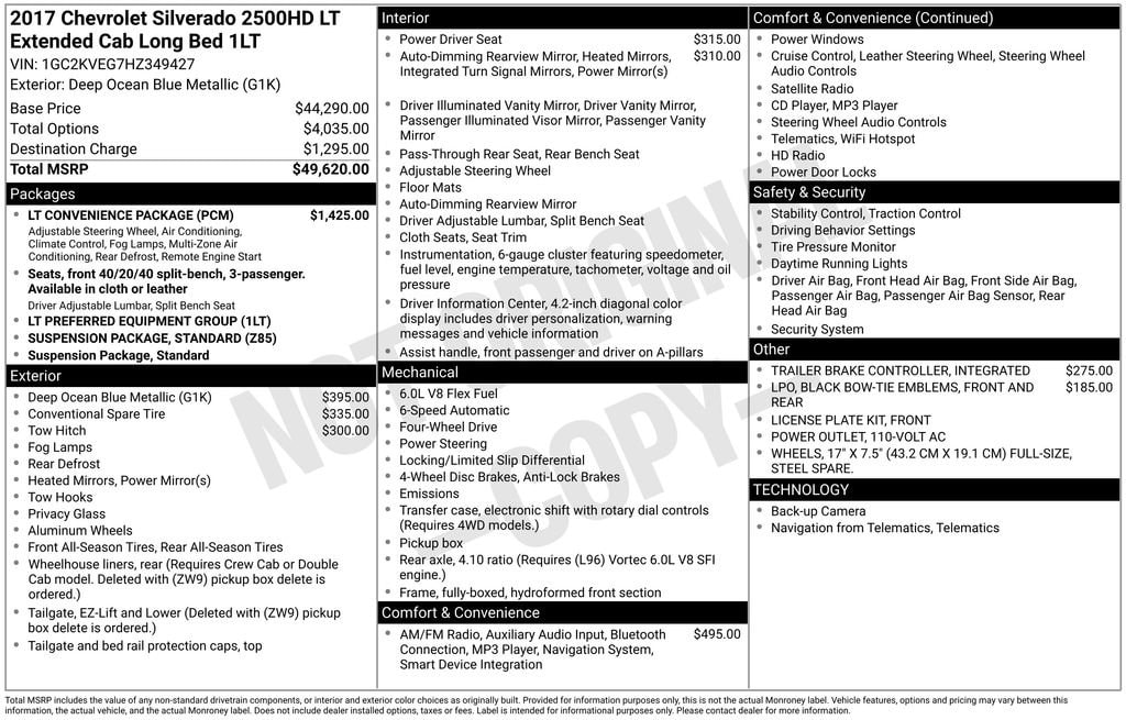 *The advertised price includes all costs to be paid by the consumer for the vehicle, excluding only government fees and taxes, any finance charges, any dealer document processing charge, any electronic filing charge, and any emission testing charge. Any dealer-installed equipment or accessories required for the purchase of the vehicle are included in the advertised price and are itemized on the vehicle or purchase contract. Optional products, accessories, or services—such as LoJack, windshield protection, battery protection, door edge guards, lift kits, running boards, floor liners, Royal Truck Bodies, or similar items—are not required to purchase the vehicle and may be purchased separately at an additional cost. All optional products will be clearly disclosed and itemized prior to sale and may be declined by the customer. Prices, specifications, and availability may change without notice. Not all customers will qualify for advertised incentives. See dealer for complete details. MSRP is shown for information purposes only. MSRP is not the dealer's advertised or asking price. In some instances, vehicles will sell above the MSRP.