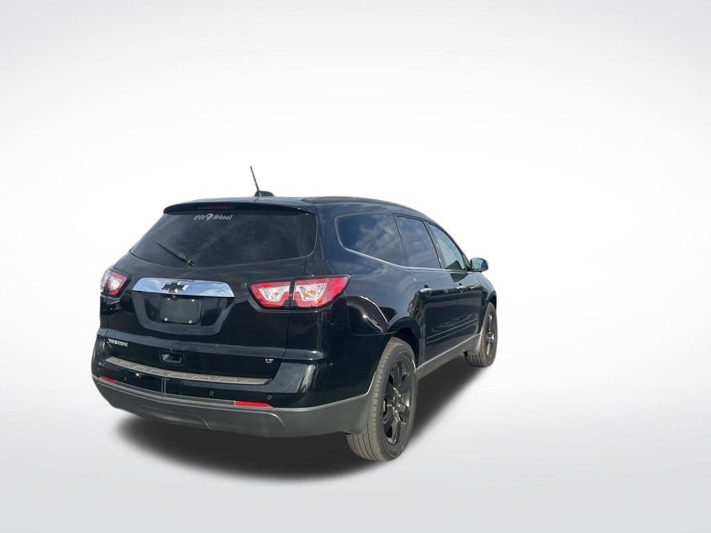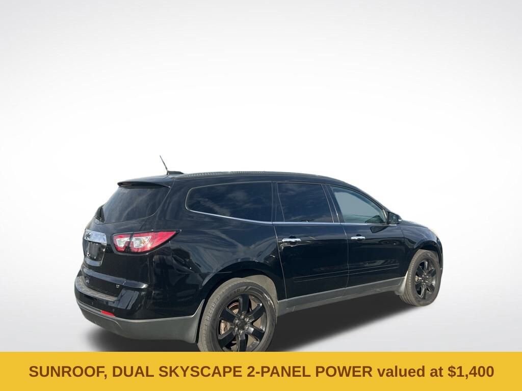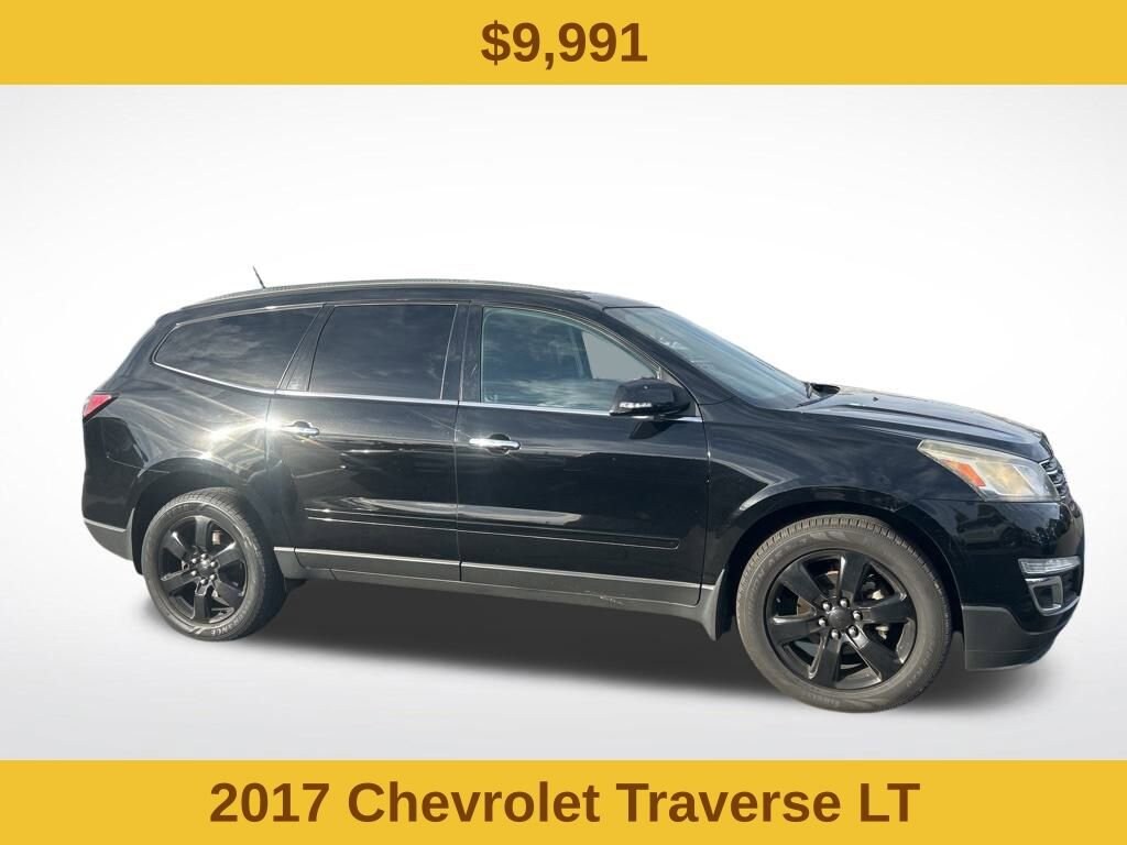 Cargo Convenience Package (Cargo Area Shade Cover and Cargo Net), Front License Plate Bracket Mounting Package, Preferred Equipment Group 1LT (8-Way Power Driver Seat w/Power Lumbar, Bluetooth® For Phone, Body-Color Bodyside Moldings, Body-Color Heated Power-Adjustable Outside Mirrors, Enhanced Driver Information Center, Front Fog Lamps, Frontal & Side-Impact Airbags, Interior Wood Grain Center Stack & Interior Trim, Leather-Wrapped Steering Wheel, Rear Park Assist, Remote Vehicle Start, and Standard Speaker System), Style & Technology Package (Heated Driver & Front Passenger Seats, Radio: Chevrolet MyLink AM/FM Stereo w/CD Player, SiriusXM Satellite Radio, Universal Home Remote, Variable Effort Power Steering, and Wheels: 20 x 7.5 Painted Aluminum (4)), Traverse LT 1LT, 4D Sport Utility, 3.6L V6 SIDI, 6-Speed Automatic, FWD, Mosaic Black Metallic, Ebony Cloth, 18 x 7.5 Machined Aluminum Wheels, 3.16 Axle Ratio, 3rd row seats: split-bench, 4-Wheel Disc Brakes, 6 Speakers, 8-Passenger Seating (2-3-3 Seating Configuration), ABS brakes, Air Conditioning, Alloy wheels, AM/FM radio: SiriusXM, Bodyside moldings, Brake assist, Bumpers: body-color, CD player, Compass, Delay-off headlights, Driver door bin, Driver vanity mirror, Dual front impact airbags, Dual front side impact airbags, Dual SkyScape 2-Panel Power Sunroof, Electronic Stability Control, Emergency communication system, Exterior Parking Camera Rear, Four wheel independent suspension, Front anti-roll bar, Front Bucket Seats, Front Center Armrest w/Storage, Front fog lights, Front reading lights, Fully automatic headlights, Heated door mirrors, Illuminated entry, Low tire pressure warning, Occupant sensing airbag, Outside temperature display, Overhead airbag, Panic alarm, Passenger door bin, Passenger vanity mirror, Power door mirrors, Power driver seat, Power steering, Power windows, Premium Cloth Seat Trim, Radio data system, Radio: Color Touch AM/FM/SiriusXM/CD Player, Rear air conditioning, Rear anti-roll bar, Rear reading lights, Rear seat center armrest, Rear window defroster, Rear window wiper, Remote keyless entry, Roof rack: rails only, Security system, Speed control, Split folding rear seat, Spoiler, Steering wheel mounted audio controls, Tachometer, Telescoping steering wheel, Tilt steering wheel, Traction control, Trip computer, Turn signal indicator mirrors, Variably intermittent wipers, and Voltmeter.