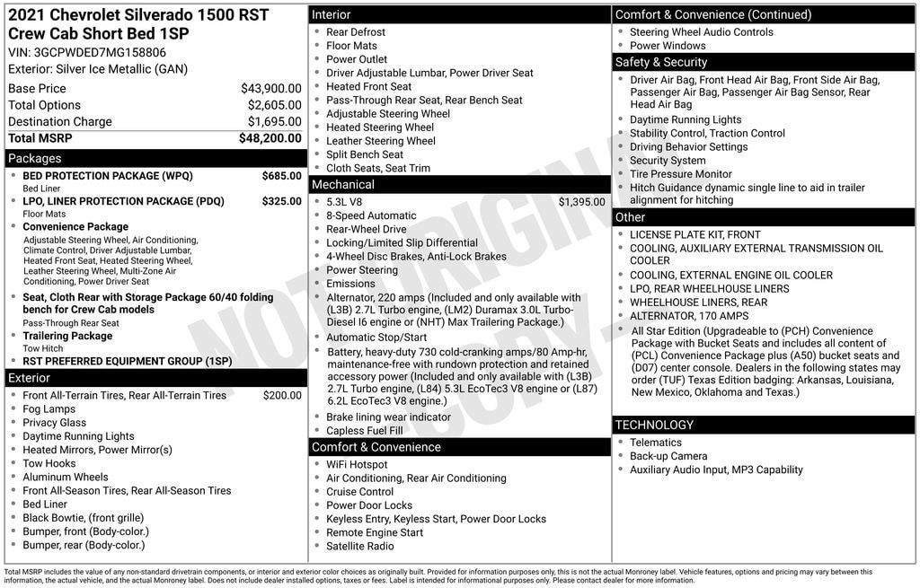 *The advertised price includes all costs to be paid by the consumer for the vehicle, excluding only government fees and taxes, any finance charges, any dealer document processing charge, any electronic filing charge, and any emission testing charge. Any dealer-installed equipment or accessories required for the purchase of the vehicle are included in the advertised price and are itemized on the vehicle or purchase contract. Optional products, accessories, or services—such as LoJack, windshield protection, battery protection, door edge guards, lift kits, running boards, floor liners, Royal Truck Bodies, or similar items—are not required to purchase the vehicle and may be purchased separately at an additional cost. All optional products will be clearly disclosed and itemized prior to sale and may be declined by the customer. Prices, specifications, and availability may change without notice. Not all customers will qualify for advertised incentives. See dealer for complete details. MSRP is shown for information purposes only. MSRP is not the dealer's advertised or asking price. In some instances, vehicles will sell above the MSRP.
