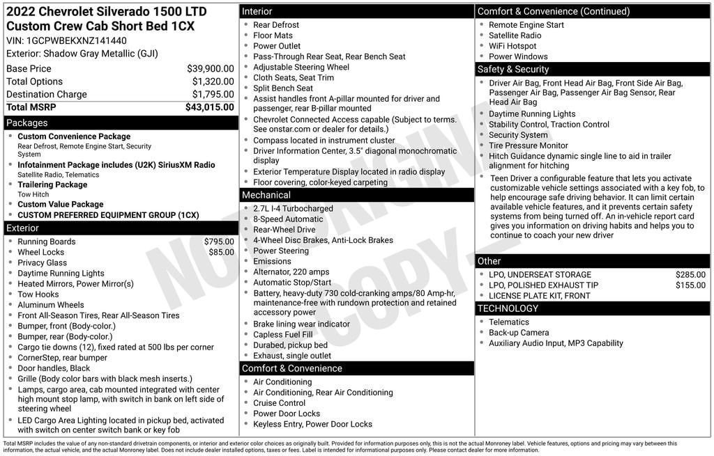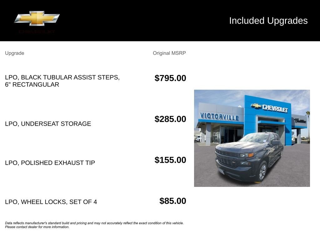*Price does not include Tax, title, license and dealer fees (unless itemized above). Not available with special finance or lease offers. Price does not include any dealer added accessories, which may include, but are not limited to: Lojack $1,995, Door Edge Guards $1,495, Battery Protection $995, Windshield Protection $1,495, Lift Kits, Royal Truck Bodies, Running Boards, Floor Liners, Market Adjustments and more. This equipment and any dealer installed accessories can be purchased by the customer at an additional cost listed on the vehicle. Information provided is believed accurate, however all specifications, pricing, and availability must be confirmed with the dealer.All prices, specifications and availability subject to change. Please contact dealer for complete & accurate pricing details. MSRP is shown for information purposes only. MSRP is not the dealer's advertised or asking price. In some instances, vehicles will sell above the MSRP.