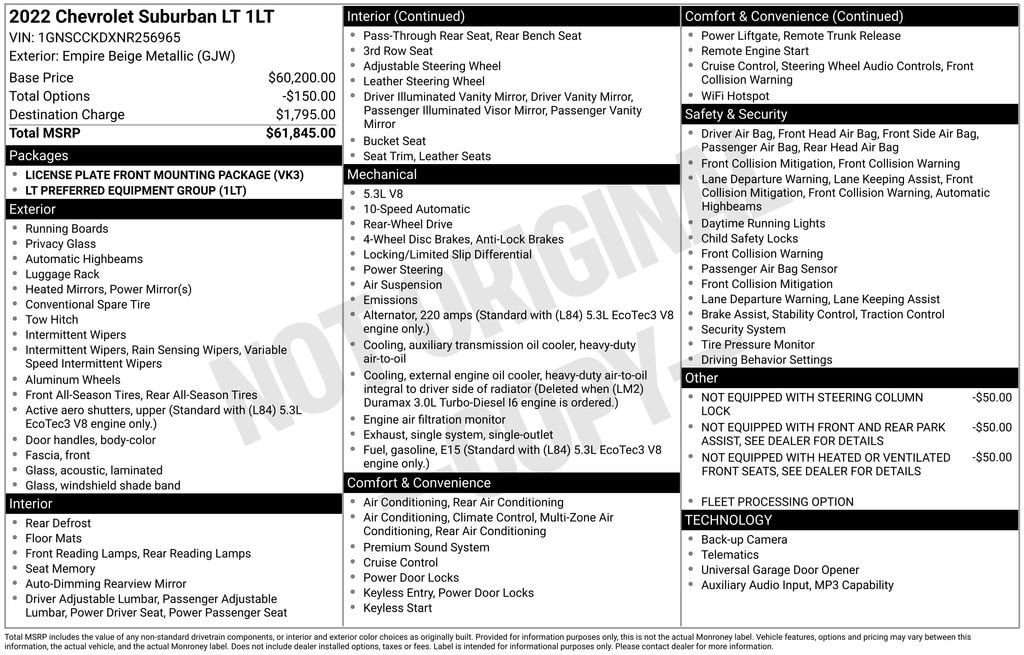 Empire Beige Metallic 2022 Chevrolet Suburban LT RWD 10-Speed Automatic with Overdrive EcoTec3 5.3L V8 Suburban LT, 4D Sport Utility, EcoTec3 5.3L V8, 10-Speed Automatic with Overdrive, RWD, Empire Beige Metallic, Black Leather.