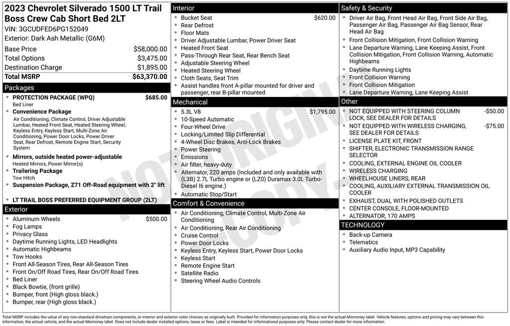 *The advertised price includes all costs to be paid by the consumer for the vehicle, excluding only government fees and taxes, any finance charges, any dealer document processing charge, any electronic filing charge, and any emission testing charge. Any dealer-installed equipment or accessories required for the purchase of the vehicle are included in the advertised price and are itemized on the vehicle or purchase contract. Optional products, accessories, or services—such as LoJack, windshield protection, battery protection, door edge guards, lift kits, running boards, floor liners, Royal Truck Bodies, or similar items—are not required to purchase the vehicle and may be purchased separately at an additional cost. All optional products will be clearly disclosed and itemized prior to sale and may be declined by the customer. Prices, specifications, and availability may change without notice. Not all customers will qualify for advertised incentives. See dealer for complete details. MSRP is shown for information purposes only. MSRP is not the dealer's advertised or asking price. In some instances, vehicles will sell above the MSRP.