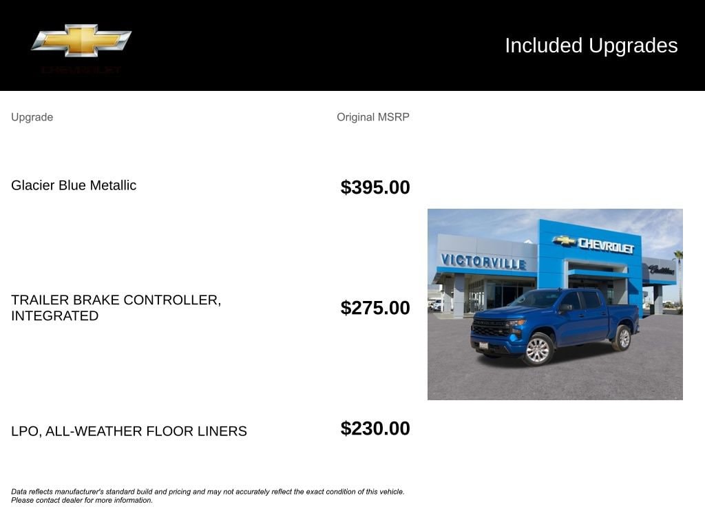 *The advertised price includes all costs to be paid by the consumer for the vehicle, excluding only government fees and taxes, any finance charges, any dealer document processing charge, any electronic filing charge, and any emission testing charge. Any dealer-installed equipment or accessories required for the purchase of the vehicle are included in the advertised price and are itemized on the vehicle or purchase contract. Optional products, accessories, or services—such as LoJack, windshield protection, battery protection, door edge guards, lift kits, running boards, floor liners, Royal Truck Bodies, or similar items—are not required to purchase the vehicle and may be purchased separately at an additional cost. All optional products will be clearly disclosed and itemized prior to sale and may be declined by the customer. Prices, specifications, and availability may change without notice. Not all customers will qualify for advertised incentives. See dealer for complete details. MSRP is shown for information purposes only. MSRP is not the dealer's advertised or asking price. In some instances, vehicles will sell above the MSRP.