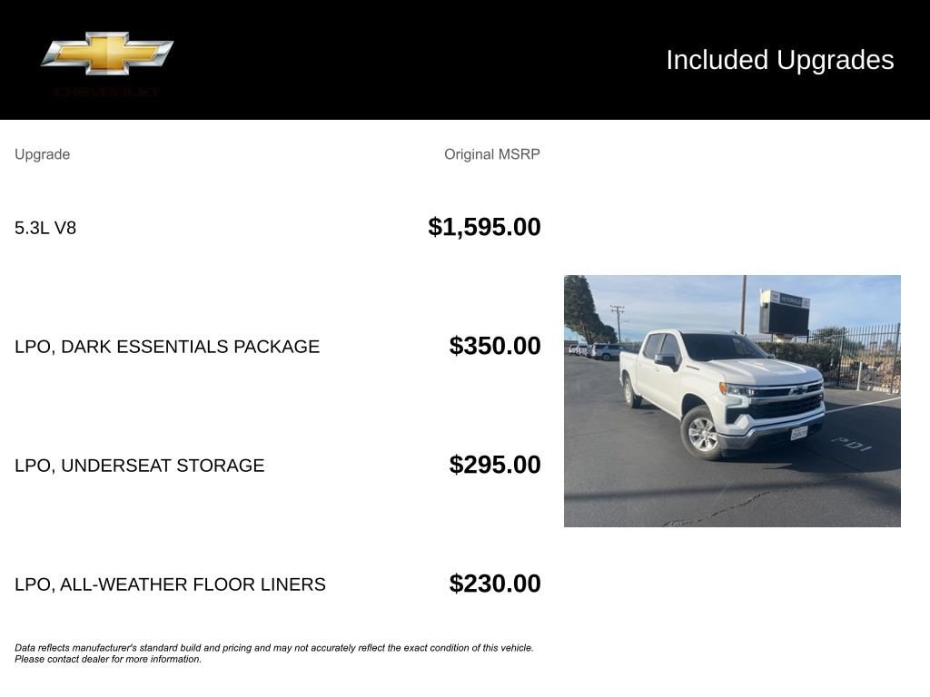 Summit White 2024 Chevrolet Silverado 1500 LT RWD 10-Speed Automatic EcoTec3 5.3L V8 Silverado 1500 LT, 4D Crew Cab, EcoTec3 5.3L V8, 10-Speed Automatic, RWD, Summit White, Jet Black Cloth.Why Buy from Victorville Chevrolet? We have received Chevroletâs Dealer of the Year award multiple years in a row. Been voted locally Best of the Desert by the Daily Press. We are the highest volume selling dealership in the high desert and treat you like family. At Victorville Chevrolet, we do things differently. Our team is built around accuracy, honesty, and accountability from your first interaction to the moment you drive home. We provide: Verified availability checked by real managers Transparent, upfront pricing with no hidden fees A relaxed, zero-pressure experience Fast, consistent communication Access to inventory across Southern California if we donât have your exact match A better Chevy experience starts right here at Victorville Chevrolet. Recent Arrival! Odometer is 3171 miles below market average!Why Buy from Victorville Chevrolet? We have received Chevroletâs Dealer of the Year award multiple years in a row. Been voted locally Best of the Desert by the Daily Press. We are the highest volume selling dealership in the high desert and treat you like family. At Victorville Chevrolet, we do things differently. Our team is built around accuracy, honesty, and accountability from your first interaction to the moment you drive home. We provide: Verified availability checked by real managers Transparent, upfront pricing with no hidden fees A relaxed, zero-pressure experience Fast, consistent communication Access to inventory across Southern California if we donât have your exact match A better Chevy experience starts right here at Victorville Chevrolet.