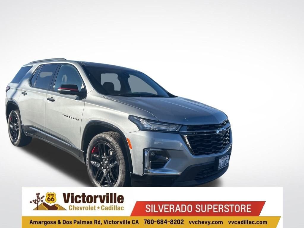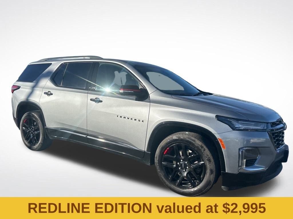 Cargo Package (LPO) (Retractable Cargo Shade and Vertical Cargo Net (LPO)), Floor Liner Package (LPO) (1st & 2nd Row All-Weather Floor Liner (LPO), 3rd Row All-Weather Floor Liner (LPO), and Integrated Cargo Liner (LPO)), Front License Plate Bracket Mounting Package, Preferred Equipment Group 1LZ, Redline Edition (Black Door Handles, Black Roof Rails, Dual SkyScape 2-Panel Power Sunroof, Front & Rear Black Bowtie, Ornamentation, Redline Accent Decals (LPO), and Wheels: 20 Gloss Black Painted Alum w/Red Stripes), Trailering Equipment (Heavy-Duty Cooling System, Hitch Guidance w/Hitch View, and Trailering Assist Guidelines), Traverse Limited Premier, 4D Sport Utility, 3.6L V6 SIDI VVT, 9-Speed Automatic, FWD, Sterling Gray Metallic, Jet Black Leather, 10 Speakers, 3.49 Axle Ratio, 3rd row seats: split-bench, 4-Wheel Disc Brakes, 6-Way Power Front Passenger Seat, 8-Way Power Driver Seat Adjuster, ABS brakes, Air Conditioning, Alloy wheels, AM/FM radio: SiriusXM with 360L, Apple CarPlay/Android Auto, Auto High-beam Headlights, Auto-dimming door mirrors, Auto-dimming Rear-View mirror, Automatic temperature control, Bose Premium 10-Speaker Audio System Feature, Brake assist, Bumpers: body-color, Compass, Delay-off headlights, Driver door bin, Driver vanity mirror, Dual front impact airbags, Dual front side impact airbags, Electronic Stability Control, Emergency communication system, Exterior Parking Camera Rear, Four wheel independent suspension, Front anti-roll bar, Front Bucket Seats, Front Center Armrest, Front dual zone A/C, Front Passenger 2-Way Power Lumbar, Front reading lights, Fully automatic headlights, Garage door transmitter, Heated 2nd Row Outboard Position Seats, Heated door mirrors, Heated Driver & Front Passenger Seats, Heated front seats, Heated rear seats, Heated steering wheel, Illuminated entry, Leather steering wheel, Low tire pressure warning, Memory seat, Navigation System, Occupant sensing airbag, Outside temperature display, Overhead airbag, Overhead console, Panic alarm, Passenger door bin, Passenger vanity mirror, Perforated Leather-Appointed Seat Trim, Power door mirrors, Power Driver Lumbar Control, Power driver seat, Power Liftgate, Power passenger seat, Power steering, Power windows, Premium audio system: Chevrolet Infotainment 3 Plus, Radio data system, Radio: Chevrolet Infotainment 3 Plus System w/Navi, Rear air conditioning, Rear anti-roll bar, Rear reading lights, Rear window defroster, Rear window wiper, Remote keyless entry, Security system, SiriusXM w/360L, Speed control, Speed-sensing steering, Spoiler, Steering wheel memory, Steering wheel mounted audio controls, Tachometer, Telescoping steering wheel, Tilt steering wheel, Traction control, Trip computer, Turn signal indicator mirrors, Variably intermittent wipers, Ventilated Driver & Front Passenger Seats, Ventilated front seats, Voltmeter, and Wheels: 20 Metallic Machined-Face Aluminum.