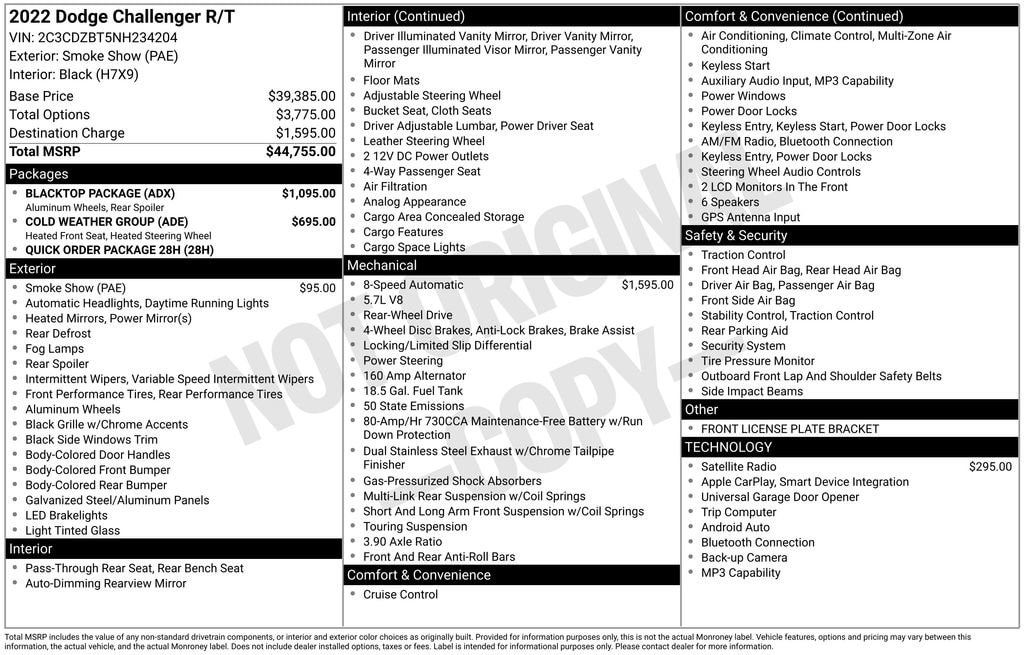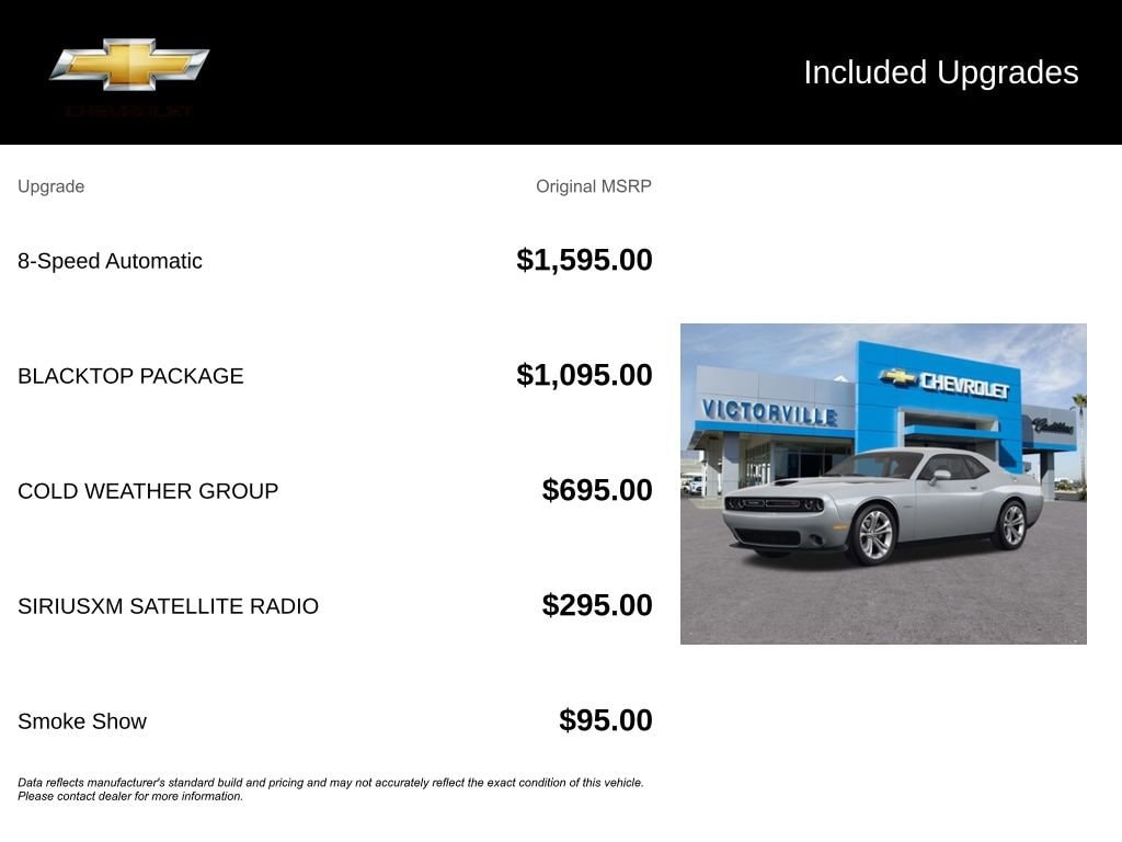 Blacktop Package (Rear Black Spoiler and Wheels: 20 x 8.0 Black Noise Painted), Cold Weather Group, Quick Order Package 28H, Challenger R/T, 2D Coupe, HEMI 5.7L V8 Multi Displacement VVT, 8-Speed Automatic, RWD, Smoke Show, Black Cloth, 4-Wheel Disc Brakes, 6 Speakers, ABS brakes, Air Conditioning, Alloy wheels, AM/FM radio, Anti-whiplash front head restraints, Apple CarPlay, Apple CarPlay/Android Auto, Auto-dimming Rear-View mirror, Automatic temperature control, Brake assist, Bumpers: body-color, Compass, Compass Gauge, Delay-off headlights, Driver door bin, Driver vanity mirror, Dual front impact airbags, Dual front side impact airbags, Electronic Stability Control, Four wheel independent suspension, Front anti-roll bar, Front Bucket Seats, Front Center Armrest, Front dual zone A/C, Front fog lights, Front License Plate Bracket, Front reading lights, Fully automatic headlights, Garage door transmitter, Google Android Auto, GPS Antenna Input, Heated door mirrors, Houndstooth Cloth Performance Seats, Illuminated entry, Integrated Center Stack Radio, Integrated Voice Command w/Bluetooth, Leather Shift Knob, Low tire pressure warning, Media Hub (2 USB, AUX), Outside temperature display, Overhead airbag, Overhead console, Panic alarm, ParkView Rear Back-Up Camera, Passenger door bin, Passenger vanity mirror, Power door mirrors, Power driver seat, Power steering, Power windows, Radio data system, Radio: Uconnect 4 w/7 Display, Rear anti-roll bar, Rear reading lights, Rear seat center armrest, Rear window defroster, Remote keyless entry, Security system, SiriusXM Radio Service, SiriusXM Satellite Radio, Speed control, Speed-sensing steering, Split folding rear seat, Spoiler, Sport steering wheel, Steering wheel mounted audio controls, Tachometer, Telescoping steering wheel, Tilt steering wheel, Traction control, Trip computer, USB Host Flip, Variably intermittent wipers, and Wheels: 20 x 8.0 Satin Carbon Aluminum.