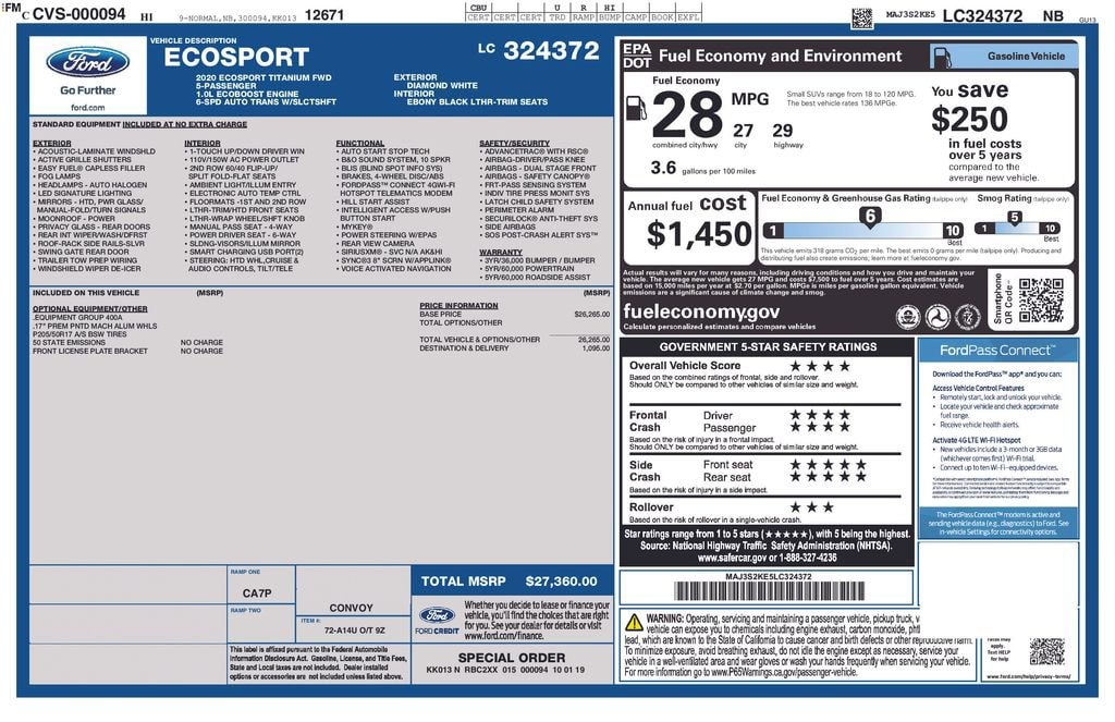 EcoSport Titanium, 4D Sport Utility, EcoBoost 1.0L I3 GTDi DOHC Turbocharged VCT, 6-Speed Automatic, FWD, Diamond White, Ebony Black Leather, 10 Speakers, 3.44 Axle Ratio, 4-Wheel Disc Brakes, ABS brakes, Air Conditioning, Alloy wheels, AM/FM radio: SiriusXM, AppLink/Apple CarPlay and Android Auto, Auto-dimming Rear-View mirror, Automatic temperature control, Brake assist, Bumpers: body-color, Compass, Delay-off headlights, Driver door bin, Driver vanity mirror, Dual front impact airbags, Dual front side impact airbags, Electronic Stability Control, Emergency communication system: SYNC 3 911 Assist, Exterior Parking Camera Rear, Front anti-roll bar, Front Bucket Seats, Front Center Armrest, Front fog lights, Front reading lights, Front wheel independent suspension, Fully automatic headlights, Heated door mirrors, Heated front seats, Heated steering wheel, Illuminated entry, Knee airbag, Leather Shift Knob, Leather steering wheel, Low tire pressure warning, Navigation System, Occupant sensing airbag, Outside temperature display, Overhead airbag, Overhead console, Panic alarm, Passenger door bin, Passenger vanity mirror, Perforated Leather-Trimmed Heated Bucket Seats, Power door mirrors, Power driver seat, Power moonroof, Power steering, Power windows, Radio data system, Radio: AM/FM Stereo w/MP3 Capable, Rain sensing wipers, Rear Parking Sensors, Rear seat center armrest, Rear side impact airbag, Rear window defroster, Rear window wiper, Remote keyless entry, Roof rack: rails only, Security system, SiriusXM Radio, SiriusXM Traffic & Travel Link, Speed control, Speed-sensing steering, Split folding rear seat, Steering wheel mounted audio controls, SYNC 3 Communications & Entertainment System, Tachometer, Telescoping steering wheel, Tilt steering wheel, Traction control, Trip computer, Turn signal indicator mirrors, Variably intermittent wipers, and Wheels: 17 Premium Dark Stainless-Painted.