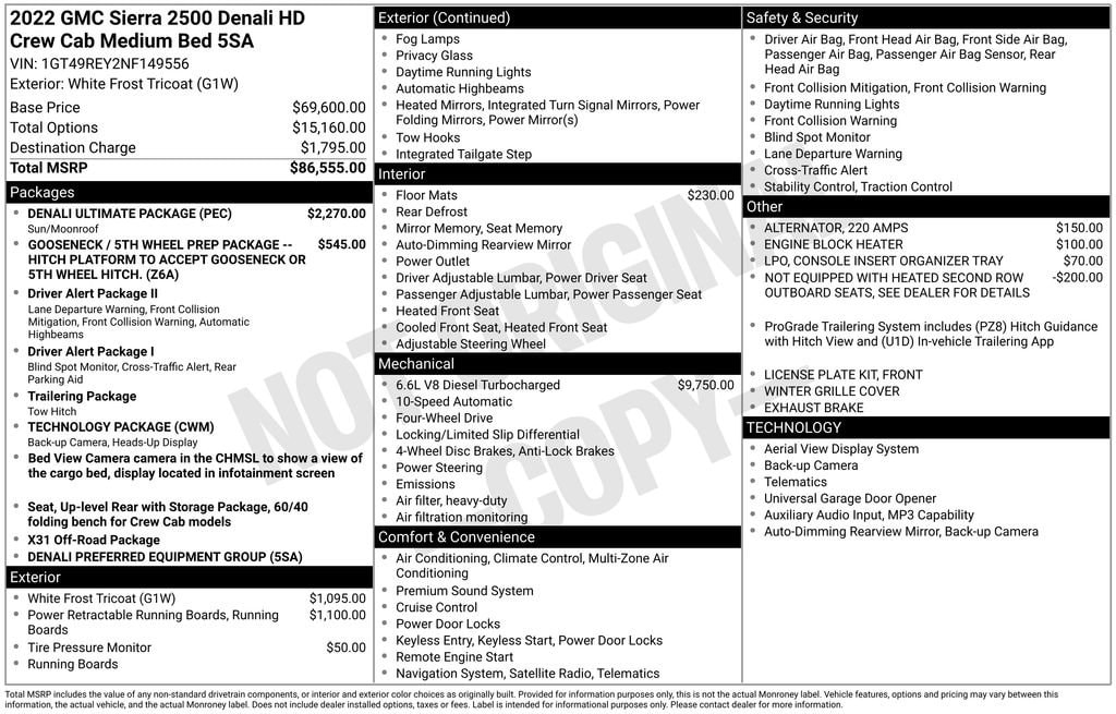 Denali Ultimate Package (Power Sunroof), Driver Alert Package I (Lane Change Alert w/Side Blind Zone Alert and Rear Cross Traffic Alert), Driver Alert Package II (Automatic Emergency Braking, Following Distance Indicator, Forward Collision Alert, IntelliBeam Automatic High Beam On/Off, and Lane Departure Warning System), Gooseneck/5th Wheel Prep Package, Preferred Equipment Group 5SA (12-Volt Rear Auxiliary Power Outlet, 120-Volt Bed Mounted Power Outlet, 120-Volt Instrument Panel Power Outlet, 2 USB Ports, 2 USB Ports (1st Row), 2-Speed Active Transfer Case, 2nd Row Dual USB Charge-Only Ports, 6 Rectangular Chromed Tubular Assist Steps, Bed View Camera w/2 Trailer Camera Provisions, Compass Located In Instrument Cluster, Deep-Tinted Glass, Electric Rear-Window Defogger, Electrical Lock Control Steering Column, Floor-Mounted Center Console, Front Chrome Recovery Hooks, GMC Connected Access Capable, HD Surround Vision w/2 Trailer View Camera Provisions, Heated & Ventilated Front Bucket Seats, Heated Driver & Front Outboard Passenger Seats, Integrated Trailer Brake Controller, Keyless Open & Start, LED Cargo Area Lighting, LED Smoked Amber Roof Marker Lamps, Manual Tilt-Wheel/Telescoping Steering Column, OnStar & GMC Connected Services Capable, Polished Exhaust Tip, Power Door Locks, Power Front Passenger Windows w/Express Up/Down, Power Rear Windows w/Express Down, Power Sliding Rear Window w/Defogger, Power Windows w/Driver Express Up/Down, Rear Wheelhouse Liners, Remote Vehicle Starter System, Safety Alert Seat, Signature Denali Grille, Spray-On Pickup Box Bed Liner w/Denali Logo, Steering Wheel Audio Controls, Unauthorized Entry Theft-Deterrent System, Universal Home Remote, Wi-Fi Hotspot Capable, Wireless Charging, and Wireless Phone Projection), Technology Package (Inside Rearview Auto-Dimming Rear Camera Mirror and Multicolor 15 Diagonal Head-Up Display), X31 Off-Road Package (Hill Descent Control), Sierra 2500HD Denali, 4D Crew Cab, Duramax 6.6L V8 Turbodiesel, 10-Speed Automatic, 4WD, White Frost Tricoat, Jet Black Leather, 10-Way Power Driver Seat Adjuster w/Lumbar, 10-Way Power Passenger Seat Adjuster w/Lumbar, 220 Amps Alternator, 4-Wheel Disc Brakes, 7 Speakers, ABS brakes, Air Conditioning, All-Weather Floor Liners (LPO), Alloy wheels, AM/FM radio: SiriusXM with 360L, Apple CarPlay/Android Auto, Auto High-beam Headlights, Auto-dimming door mirrors, Auto-dimming Rear-View mirror, Automatic temperature control, Bose Premium 7 Speaker Sound System, Brake assist, Bumpers: body-color, Compass, Console Insert Organizer Tray (LPO) (DISC), Delay-off headlights, Driver door bin, Driver Memory, Driver vanity mirror, Dual front impact airbags, Dual front side impact airbags, Electronic Stability Control, Emergency communication system: OnStar and GMC Connected Services capable, Engine Block Heater, Exhaust Brake, Exterior Parking Camera Rear, Forge Perforated Leather-Appointed Front Seat Trim, Front anti-roll bar, Front Bucket Seats, Front Center Armrest, Front dual zone A/C, Front fog lights, Front License Plate Kit, Front reading lights, Front wheel independent suspension, Fully automatic headlights, Garage door transmitter, Genuine wood console insert, Genuine wood door panel insert, Heated door mirrors, Heated front seats, Heated steering wheel, Heavy-Duty 80 Amp Battery, Hitch Guidance w/Hitch View, Illuminated entry, In-Vehicle Trailering System App, Low tire pressure warning, Memory seat, Navigation System, Not Equipped w/Heated 2nd Row Outboard Seats, Occupant sensing airbag, Off-Road Suspension, Outside temperature display, Overhead airbag, Overhead consol