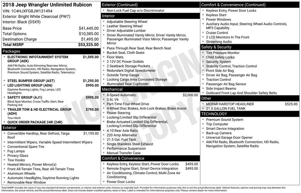 Bright White Clearcoat 2018 Jeep Wrangler Unlimited Rubicon 4WD 8-Speed Automatic 3.6L V6 24V VVT Wrangler Unlimited Rubicon, 4D Sport Utility, 3.6L V6 24V VVT, 8-Speed Automatic, 4WD, Bright White Clearcoat, Black Cloth.