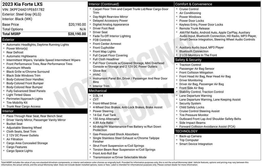 Forte LXS, 4D Sedan, 2.0L I4 MPI, FWD, Steel Gray, Black Cloth, 16 x 6.5J Alloy Wheels, 4 Speakers, 4-Wheel Disc Brakes, ABS brakes, Air Conditioning, Alloy wheels, AM/FM radio, Apple CarPlay & Android Auto, Auto High-beam Headlights, Brake assist, Bumpers: body-color, Cloth Seat Trim, Delay-off headlights, Driver door bin, Driver vanity mirror, Dual front impact airbags, Dual front side impact airbags, Electronic Stability Control, Exterior Parking Camera Rear, Front anti-roll bar, Front Bucket Seats, Front Center Armrest, Front reading lights, Front wheel independent suspension, Fully automatic headlights, Illuminated entry, Low tire pressure warning, Occupant sensing airbag, Outside temperature display, Overhead airbag, Overhead console, Panic alarm, Passenger door bin, Passenger vanity mirror, Power door mirrors, Power steering, Power windows, Radio data system, Radio: 8 Display Audio, Rear window defroster, Remote keyless entry, Security system, Speed control, Split folding rear seat, Steering wheel mounted audio controls, Tachometer, Telescoping steering wheel, Tilt steering wheel, Traction control, Trip computer, and Variably intermittent wipers.
