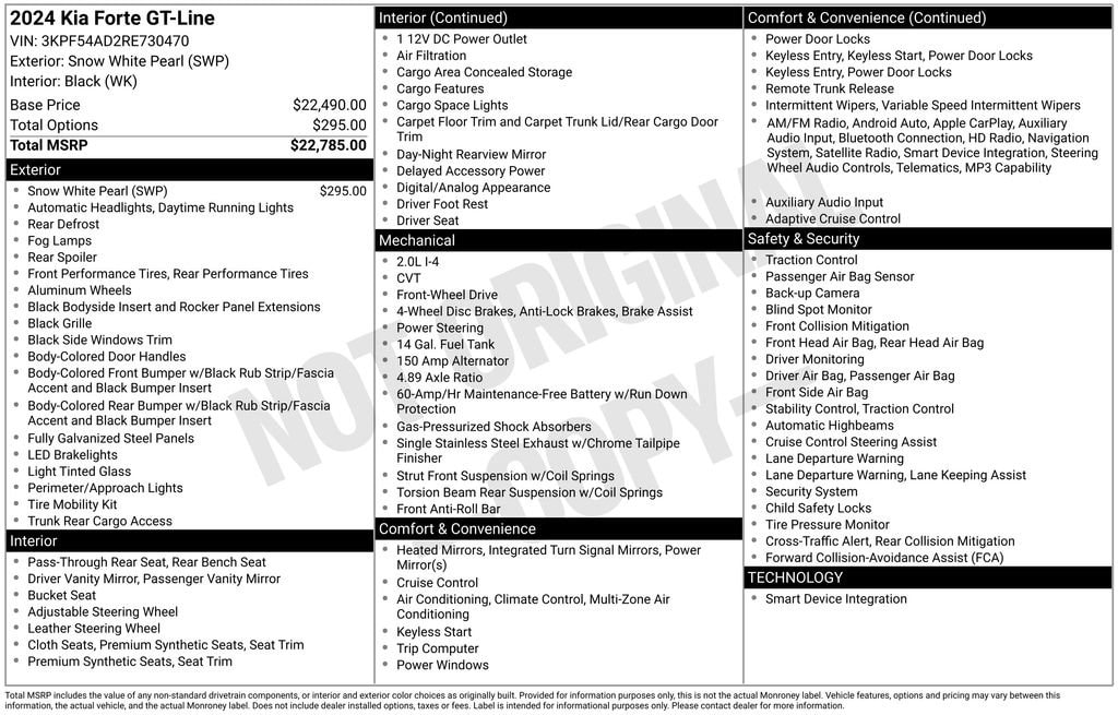 Forte GT-Line, 4D Sedan, 2.0L I4 MPI, FWD, Snow White Pearl, Black Cloth, 4-Wheel Disc Brakes, 6 Speakers, ABS brakes, Air Conditioning, Alloy wheels, AM/FM radio: SiriusXM, Apple CarPlay & Android Auto, Auto High-beam Headlights, Automatic temperature control, Brake assist, Bumpers: body-color, Cloth & SynTex Seat Trim, Delay-off headlights, Driver door bin, Driver vanity mirror, Dual front impact airbags, Dual front side impact airbags, Electronic Stability Control, Emergency communication system, Exterior Parking Camera Rear, Front anti-roll bar, Front Bucket Seats, Front Center Armrest, Front dual zone A/C, Front fog lights, Front reading lights, Front wheel independent suspension, Fully automatic headlights, Heated door mirrors, Illuminated entry, Leather Shift Knob, Leather steering wheel, Low tire pressure warning, Navigation System, Occupant sensing airbag, Outside temperature display, Overhead airbag, Overhead console, Panic alarm, Passenger door bin, Passenger vanity mirror, Power door mirrors, Power steering, Power windows, Radio data system, Radio: 10.25 Display Audio, Rear seat center armrest, Rear window defroster, Remote keyless entry, Security system, Speed control, Split folding rear seat, Spoiler, Sport steering wheel, Steering wheel mounted audio controls, Tachometer, Telescoping steering wheel, Tilt steering wheel, Traction control, Trip computer, Turn signal indicator mirrors, Variably intermittent wipers, and Wheels: 17 x 7.0 Alloy.