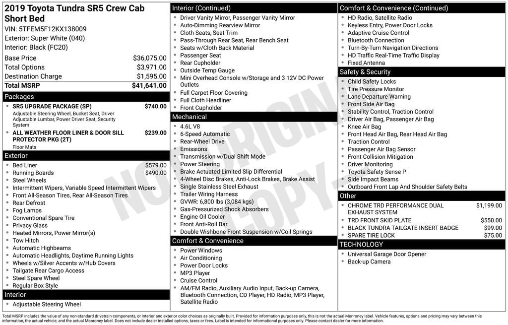 Super White 2019 Toyota Tundra SR5 4.6L V8 RWD 6-Speed Automatic Electronic with Overdrive 4.6L V8 DOHC Dual VVT-i 32V Graphite Cloth, ABS brakes, Active Cruise Control, Compass, Electronic Stability Control, Heated door mirrors, Illuminated entry, Low tire pressure warning, Remote keyless entry, Traction control.